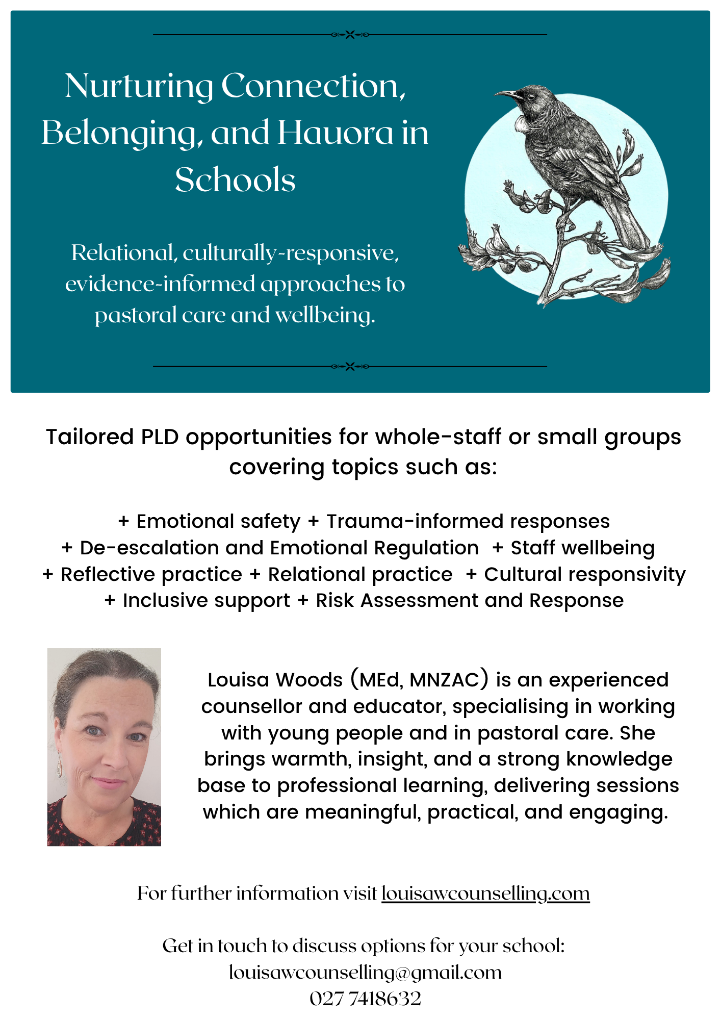 In addition to counselling services, I am available to run workshops and deliver presentations on a range of topics relevant to hauora and pastoral care. With twenty years working as a teacher and guidance counsellor, and five years teaching Guidance in Education on the Massey University PGDip Counselling, and in the Masters programme, I combine experience and understanding of the school context with research and best practice approaches to deliver professional learning opportunities which are relevant, engaging, and which support hauora across the school.